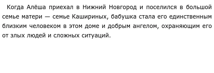 Одной из главных героев повести является бабушка Алексея Пешкова — Акулина Ивановна. Она была очень хорошим человеком, пережившим многое. Бабушка приобретает огромное значение в жизни Алёши после смерти отца.