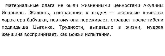 Акулина Ивановна — смелая и решительная женщина. Она никогда не жалела себя и часто ставила себя под удар, защищая других. Эти качества проявились во время пожара, когда бабушка, не растерявшись, руководила всеми, а дед стоял и смотрел. Чтобы спасти других, она кинулась в огонь, не жалея себя. Добрая женщина заботилась не только о своей семье, но и об окружающих, она была всегда готова прийти на помощь.