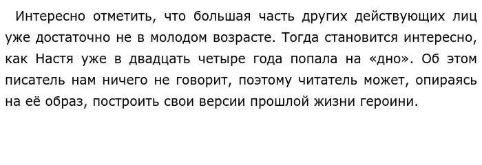 Вот такой перед нами предстает героиня пьесы Горького Настя. В конце произведения её жизнь не изменилась, она никуда не ушла, хотя и хотела этого. Вполне вероятно, что её будущее не будет особо радостным. Все дальше углубляясь в свои мечты и желания, девушка ещё больше разочаруется в своей жизни, и будет её ждать такой же конец, как у Актёра, который в итоге удавился. Ведь она не сможет справиться с таким несправедливым миром. И поступить как Лука она не сможет, ведь тот ушел, а она лишь мечтает, ничего не предпринимая для этого.