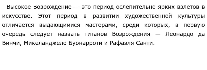 Творчество трёх великих итальянских мастеров Леонардо да Винчи, Микеланджело Буонарроти и Рафаэля Санти знаменует Вершину Возрождения. Они были больше, чем художники. Они были философами, объясняли мир с помощью живописи.