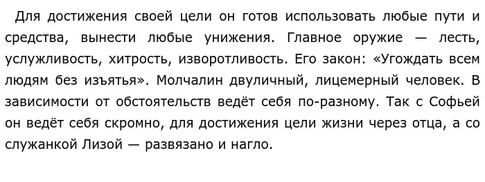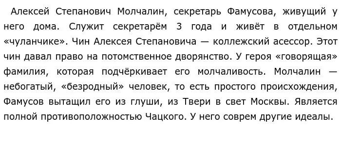 Таким образом, можно сделать следующие выводы: Чацкий и Молчалин в комедии являются полной противоположностью друг друга, они совершенно разные по натуре и по ценностям. Общество отвергает Чацкого, а принимает Молчалина, так как московские дворяне хотят, чтобы перед ними выслуживались, преклонялись, завоёвывали их расположение, а этим идеалам Молчалин соответствует лучше, чем Чацкий.
