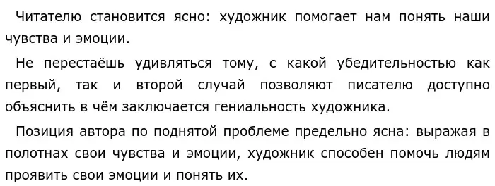 Итак, анализируя текст Константина Георгиевича, я прихожу к выводу, что проблема, поднятая писателем, актуальна и сейчас: гениальность художника заключается в умении с помощью своих картин пробудить чувства и вызвать эмоции человека, которые раньше он не понимал и не испытывал.
