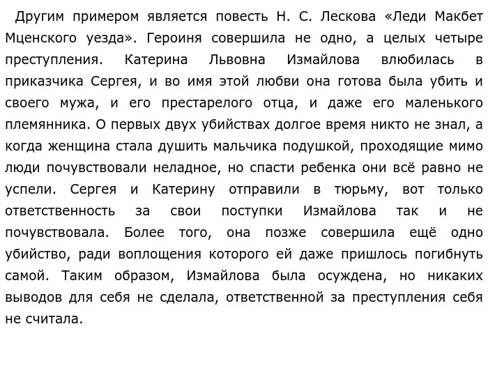 Преступления — это отчаянный шаг, на который способен далеко не каждый человек, потому что не каждый человек способен переступить черту нравственности и морали. Но имеет ли человек право на преступление? Я думаю, что человек не вправе творить судьбы других людей. И за свои деяния, как правило, люди несут ответственность. Нельзя считать себя судьёй всего происходящего. Классики русской литературы обращались к этой теме в своих произведениях.
