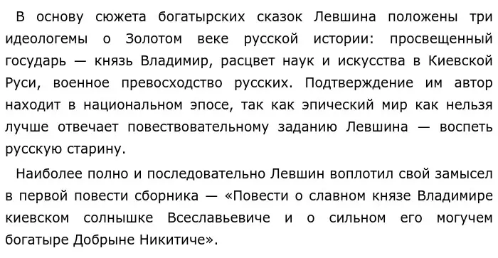Не случайно именно повестью о Добрыне Никитиче и повестями о других богатырях, служивших князю Владимиру, Левшин открывает свой сборник. Русские былины для него — ответ европейским авторам. Давая им рыцарскую интерпретацию, он фактически сближает древнюю Русь с просвещенной Европой. При этом не следует забывать, что образ исторического князя Владимира не только в православной, но и в светской традиции неотделим от идеи просвещения Руси. В русской литературе XVIII в. параллель между царём-просветителем Петром и князем-просветителем Владимиром становится общим местом. Лёвшин как бы призывает соотечественников к совместному труду, служению отечеству и прославлению Родины посредством введения в богатырские сказки патриотических образов.