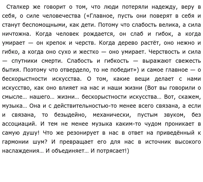 Ну и когда заканчивается путешествие, все идут по домам. Жена укладывает Сталкера отдыхать, и начинается разговор со зрителем. Мы узнаем, что Сталкер на самом деле блаженный, поэтому он такой искренний, честный и чистый душой. Его мир не испортил, да и не сможет испортить вообще.