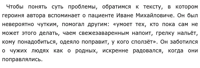 Далее рассказчица акцентирует наше внимание на том, что доброта проявляется в заботе не только о физическом, но и моральном состоянии человека. Так, благодаря поддержке нашего героя, «излечился» Володя, которому пришлось ампутировать раздробленную голень. Желание Ивана Михайловича помочь спасло молодого парня, он «поверил в себя снова».