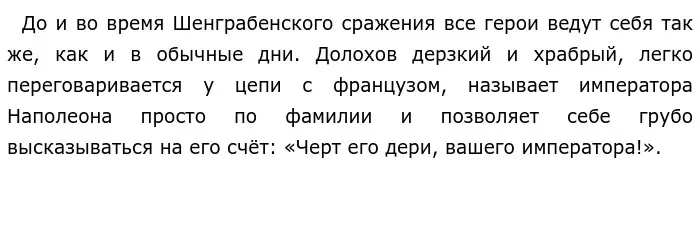 По мнению автора, Тимошин проявляет истинный героизм. Долохов, в противовес Тимохину, бьется ради личной славы: «Прошу запомнить, вообще превосходительство!» — настаивает герой, демонстрируя своё ранение полковому командиру.