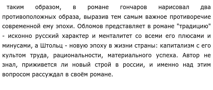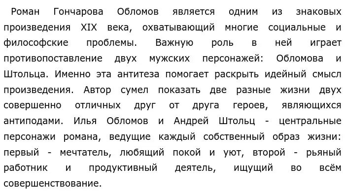 Эти мужчины являются лучшими друзьями с самого детства, но несмотря на это являются полными противоположностями. Первое различие мужчин мы видим уже в их портретных характеристиках: внешность интровертного Обломова полностью соответствует его мягкому и тихому характеру - он полный, его движениея ленивые, округлые, образу присуща изнеженность, не характерная для мужчин. Штольц же совсем не похож на друга внешне: он худой с зелёными, но выразительными глазами.
