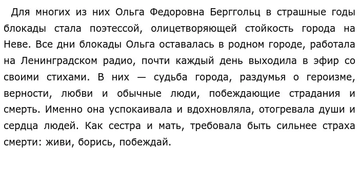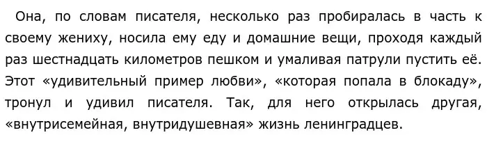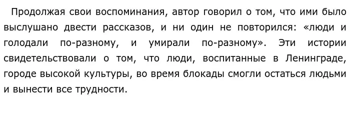 Нельзя не согласиться с Д. А. Граниным в том, что никакие трудности не смогли сломить ленинградцев потому, что они оставались человечными, не допускали эгоизма, сохраняли любовь, дружбу, уважение. Блокада — одна из самых трагичных страниц в истории Великой Отечественной войны. Голод, морозы, обстрелы, бомбежки, отсутствие электричества и водоснабжения — вот, что пришлось пережить жителям Ленинграда. Помогало всё: и величественная архитектура, и духоподъемная музыка, и литература…