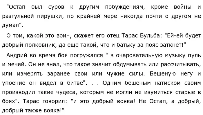 Оба сына, и Остап, и Андрий уважительно относились к отцу и к матери, но Тараса они побаивались, чувствуя в нём большую внутреннюю силу. Но, как мне кажется, Андрий был более сдержан в своих чувствах любви к матери, чем Остап. Пример тому, когда мать провожала сыновей на Сечь и обняла Остапа, это чувство надолго осталось в душе старшего сына.