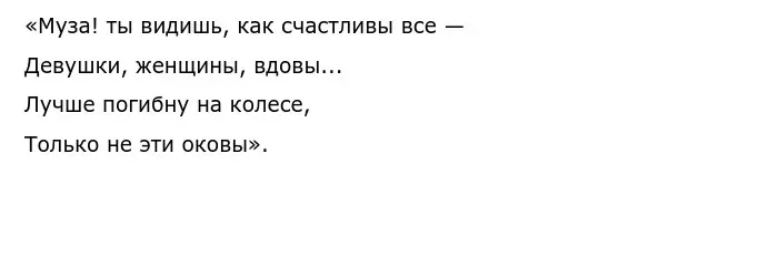 Эти строки отчетливо демонстрируют читателю намерения героини самопожертвования в пользу людей, народа, ради их счастья и процветания. Осознавая то, что счастье и отдача творческого дара несовместимы, лирическая героиня стихотворения решается на первое, так как чужие людские жизни важнее её собственной.