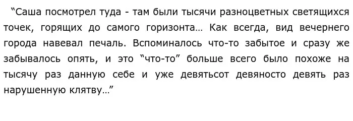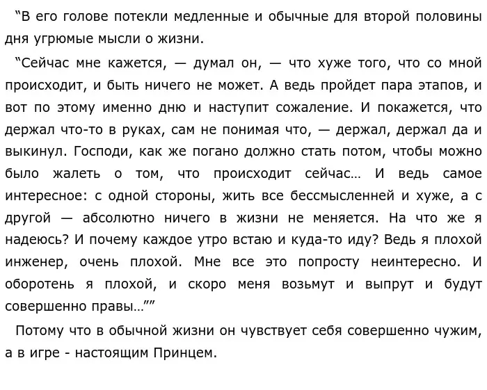 Что интересно в творчестве Виктора Олеговича, так это то, что в нем нет четкого разделения мира на “хорошее / плохое” и “черное / белое”. Его слова - это не четкие рамки и границы, а лишь зыбкие очертания идеи, накладываемые на мировоззрение читателя, и он сам делает определенные выводы. Но “Принц Госплана” стремится показать “плохую” сторону жизни. Пелевин прекрасно использует прием незаметного перехода между двумя мирами, когда читатель теряет грань между реальностью и игрой, как и сам главный герой, и все окружающие его люди: босс-самурай, коллеги-трубачи и танкисты. . . Игра требует от нас полного погружения, растраты всего своего времени и самих себя в пустоту. Звучит действительно устрашающе, но подобные ситуации происходят на каждом шагу.