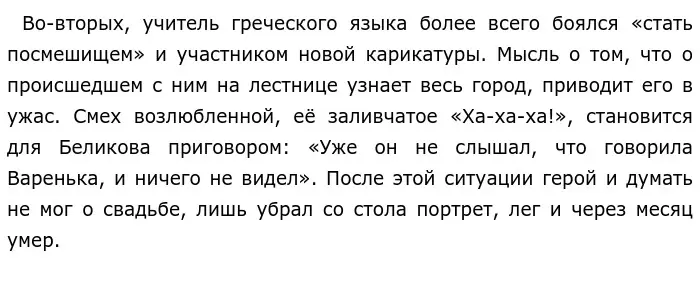 Таким образом, размышления о возможных изменениях, связанных с семейной жизнью, пугают и разрушают Беликова, он оказывается не в силах выбраться из своего «футляра».