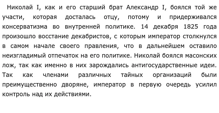 Таким образом, высказывание Ляшенко справедливо: правление Николая Первого действительно было консервативной направленности, а смерть отца и восстание декабристов, произошедшие во время становления его личности, повлияли на него и окончательно определили его взгляды и характер.