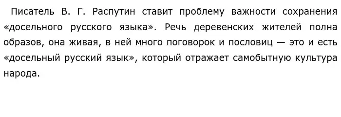 В качестве примера автор приводит воспоминания о своём детстве в ангарской деревне (предложения 1, 2) и о особенной меткой речи односельчан (предложение 12, 13). По мнению писателя, деревенская речь обладает простой красотой, она полна жизни. Продолжая рассуждение, Распутин говорит о своих университетских годах, когда он стал стыдиться своего деревенского языка. Но вскоре автор осознаёт, что нужно освободиться от вычурной «книжности», чтобы он и герои его произведений смогли говорить «легко». Так автор приходит к выводу, что использование «словечек» лишает язык естественности. Оба примера дополняют друг друга и по существу раскрывают проблему важности сохранения "досельного" русского языка.
