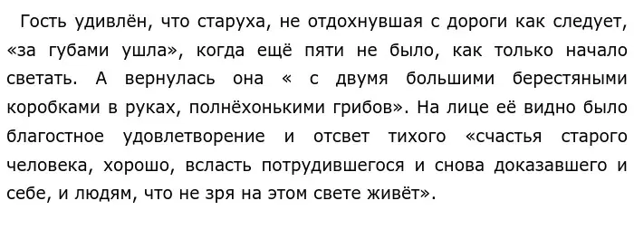 Кроме того, автор описывает старуху Милентьевну. Образ её он даёт через восприятие гостя-рассказчика, который приехал отдыхать в эту затерявшуюся в лесах деревушку.