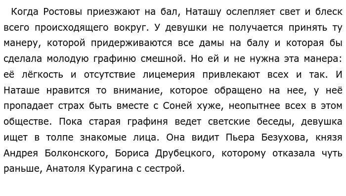 Наблюдать со стороны за чувствами главной героини, которые она выражает в своих монологах, видеть, как меняется настроение князя Андрея, как он наблюдает за Наташей, вообще присутствовать заочно на таком мероприятии и понимать его важность для главных героев хочется ещё и ещё раз. Рождественский бал — одна из сцен, которые понравились мне больше всего. Ведь именно в этих главах мы узнаем героев ещё ближе, какими не знали их до этого. Именно поэтому для нас, читателей, это такой же важный, такой же переломный момент в отношении к персонажам романа, как и для них самих в отношениях между ними.