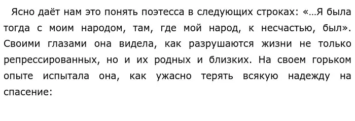 Таким образом, я считаю, А. И. Солженицын не прав, указывая, что поэма «Реквием» А. А. Ахматовой была посвящена исключительно трагедии женщины. Поэтесса рассказывала о судьбе целого народа, который она любила и с которым оставалась до конца.