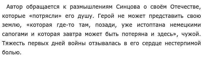 К. М. Симонов убежден в том, что люди с наступлением войны были охвачены страхом и глубокими переживаниями о будущем малой родины и всей страны, которые «давили» их души и казались нестерпимыми, но были пережиты благодаря огромной силе воли и вере в победу. Я согласна с мнением автора. Действительно, нет ни одного советского человека, которого бы не затронула война, ставшая трагедией для всего народа. Она в корне ломала представления о ценностях жизни, «колечила» людские судьбы долгие года, угрожая смертью. Сейчас и представить невозможно, какие мучения пришлось пережить воинам на фронтах, в окопах, мирным людям в тылу, в осажденных и оккупированных городах! И только надежда на светлое будущее грела их сердца.