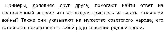 К2. –4 (из 6). Комментарий к проблеме. Приведены два правильных примера-иллюстрации. Вывод из первого примера недостаточен: не только о любви к Родине надо говорить, но и о смятении, растерянности тоже. Вид смысловой связи назван, комментарий не дан. Недостаточно сказать, что примеры-иллюстрации «помогают найти ответ на поставленный вопрос: что же людям пришлось испытать с началом войны?». Надо здесь же на него ответить.