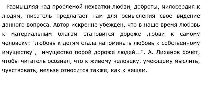 Почему людям не хватает любви, доброты, милосердия? К чему приводит нехватка этих качеств? Именно над этими вопросами заставляет нас задуматься автор текста А. А. Лиханов.