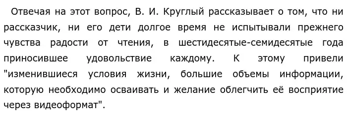 Я согласна с позицией В. И. Круглого. В современном книге потребность в книгах может утрачиваться, но если попытаться отыскать интересные произведения, то от них будет трудно оторваться. Примером, подтверждающим это, является моя бабушка, не читавшая в течение долгого времени, которая спустя много лет поняла, что ей нравятся детективы. С тех пор она никогда не расставалась с книгами.