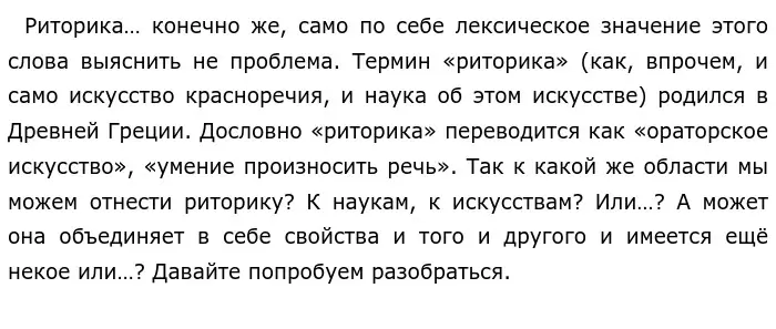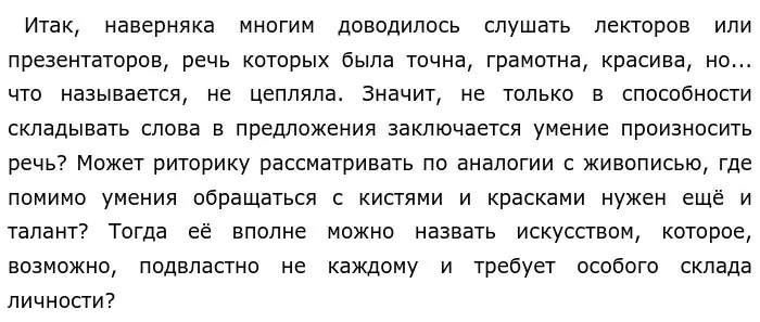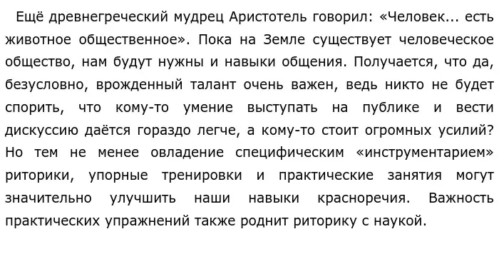 Вот мы и подошли плавно к тому, что риторика, точнее её использование в практике требует от оратора помимо знаний ещё и творческих навыков, что однозначно несет в себе и науку и искусство… И вот тут, размышляя, напрашивается не то ли самое «или…» о котором мы задумались ранее. Чего-то прямо не хватает, не правда ли? Наука, труд овладеть, научится это все логично, но… Лично меня волнует ситуация именно нашего времени, где мы проживаем свою жизнь здесь и сейчас, и все больше наше общение сводиться к краткой электронной переписке, а порой и смайликам эмодзи. Тем самым лишая себя роскоши общения. Почему же это происходит? Время такое, нехватка этого самого времени. Можно долго об этом говорить. Но думаю, здесь решение такой проблемы заключается в закладке маленьким детям этой самой риторики. И опять же нам придется обратиться в моих рассуждениях к учителям, преподавателям и хорошо бы к вечно занятым родителям. Как это важно правильно вложить с младенчества детям умение разговаривать, слушать собеседника, читать, рассуждать, фантазировать, анализировать услышанное и обязательно иметь и формировать своё мнение. Так что, вот это «или…» оказывается существует. Пафосные и весомые слова — наука, искусство — перевешивают наше скромное «или…», потому, что для него нет четкого определения или лексического значения. Это часть нашей жизни, где нельзя утопать в социальных сетях, превращаясь в «интернет ботов». Вот такое скромное «или…» для всех нас ложится огромной ответственностью за наше общество и наше будущее. Такой вот круговорот, в котором все, от младенца до преподавателя, несём важнейшую миссию умения общаться! Не так ли?