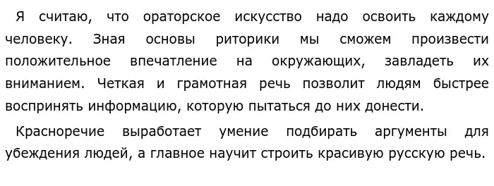 Умению говорить красиво, убеждать других в своей правоте, ораторскому искусству учит дисциплина под названием «риторика». Родилось ораторское искусство очень давно — в Древней Греции. Ораторское искусство было необходимо в судебных заседаниях, чтобы убеждать суд в виновности или невиновности подсудимого, в административных и политических органах, чтобы убеждать народ в своих идеях, в военном деле, чтобы вести войска к победе, в школах, чтобы эффективно донести знания ученикам, и во многом другом.