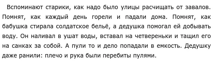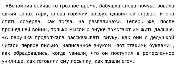 Нилин дополняет свои мысли ещё одним примером, он приводит воспоминание бабушки и дедушки о трудностях военной жизни.