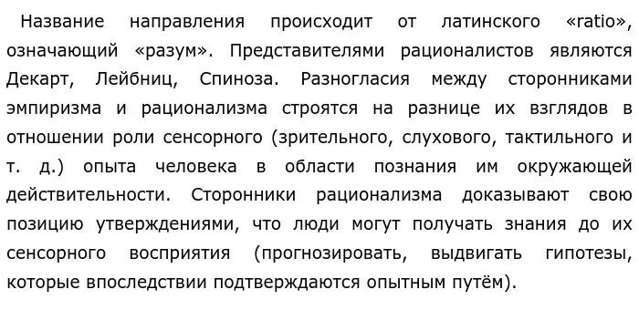 Философы средневековья задумались над этим вопросом, в результате сформировалось два направления: эмпиризм и рационализм. Эмпиризм — это то направление теории познания, согласно которой чувственный опыт является единственным источника познания. К представителям эмпиризма относятся: Галилей, Фрэнсис Бэкон (родоначальника нового эмпиризма), Гоббс, Локк, Беркли, Юма и многие другие. Рационализм, напротив, направление, в котором утверждается, что источником истинного знания является разум.