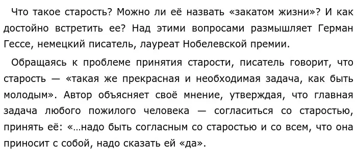 Трудно не согласиться с мнением Германа Гессе. Действительно, люди, принявшие старость такой, какая она есть, могут вызвать доброе, уважительное отношение окружающих к их почтенному возрасту, так как они смирились с постоянно изменяющимся миром и полюбили его. Так, в произведении «Отцы и дети» достойно встречает старость отец Евгения Базарова. Он не препятствует ни исследованиям сына, ни его нигилизму. Он принимает изменяющийся мир таким, какой он есть, читает и развивается, чтобы поспеть за его быстрым темпом. Такую старость я считаю достойной уважения.