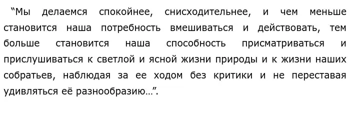Размышляя над проблемой, автор говорит о том, что быть старым вовсе не страшно и не ненавистно, поскольку старость – это такая же жизненная ступень, как и молодость, у которой есть своя красота и смысл: “. . . старость – это ступень нашей жизни, имеющая, как и любая другая её ступень, своё собственное лицо, собственную атмосферу, собственные радости и горести.