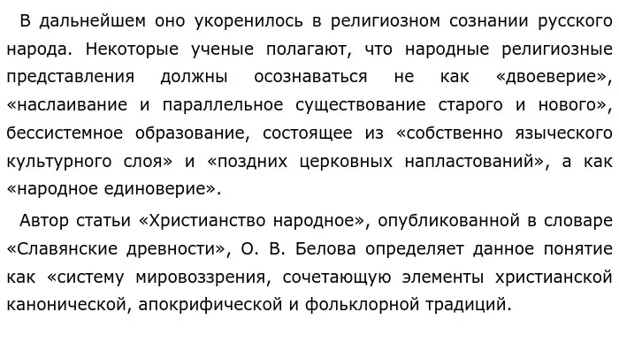 Утвердившись на Руси, христианство стало развиваться в двух направлениях: ортодоксальное (книжное) и народное. По мнению В. Д. Агафоновой, народное православие – особая форма христианской религиозности, синтез прошлых и настоящих верований, в котором сохраняются значительные элементы более древней формы религиозного культа — язычества».