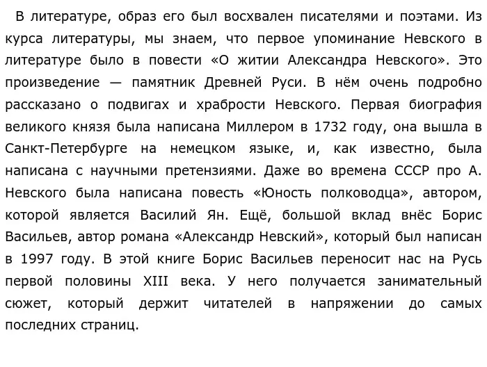 И так, выше были приведены произведения, в которых представлена личность Александра Невского. В литературе его образ — это символ непобедимости русского народа. В кинематографе он представляется, как гениальная и многогранная личность. А скульптурные образы являются памятными местами.