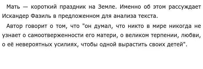 Авторская позиция ясна. Искандер Фазиль Абдулович говорит о том, что для ребёнка мать всегда останется самым важным человеком в жизни. Для него она всегда была и будет примером любви, самоотверженности, терпения.