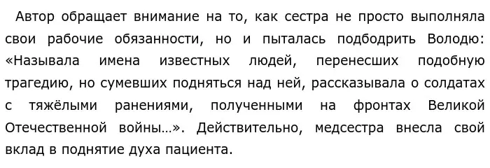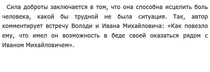 Автор продолжает рассуждать над данной проблемой, показывая то, как доброта ещё одного человека помогла Володе справиться с его болью. Иван Михайлович, один из пациентов в палате, оказывал соседу поддержку и проявлял к нему заботу. Мужчина старался подбодрить Володю, даже произнес позитивную речь, в которой приглашал его посетить свой город. Улыбка появилась на лице на лице больного, ведь внимание Ивана Михайловича вселила в него уверенность и оптимизм. Это ли не сила доброты?