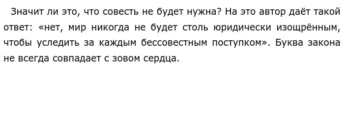 Подводя итог всему вышесказанному, можно сказать, что совесть, несмотря на попытки заменить её законом или сделать предрассудком, всё равно остаётся в сердцах людей.