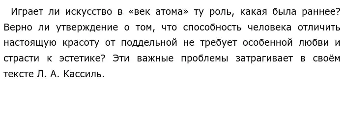 Я полностью разделяю точку зрения Л. А. Кассиля. Искусство играет огромную роль в формировании личности человека, в воспитании характера. Книги развивают нас, дают новые знания, музыка помогает обрести душевный покой, а картины позволяют увидеть красоту даже в самом простом. Кроме того, искусство обличает всё потаённое и скрытное, сохраняет действительность такой, какая она есть.