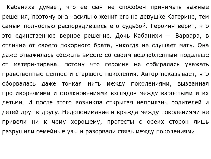 Проблема поколений прослеживается в произведении А. Н. Островского «Гроза». Главным противником молодого поколения является Кабаниха. Героиня считает своих детей неспособными принимать самостоятельные и верные решения. Поэтому представители старшего поколения по всем традициям и привычным для себя обычаям во всем приказывают детям, никогда не считаются с их мнением. Возможно, старое поколение просто боится, что ему перестанут подчиняться.