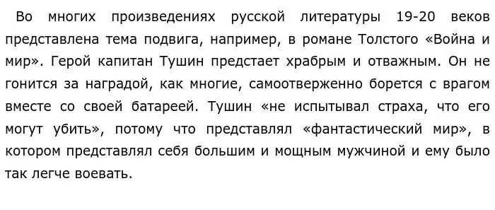 Во многих произведениях отечественной литературы изображены русские характеры, например, в романе Толстого «Война и мир». Платон Каратаев, как и Андрей Соколов, уверен в том, что если не озлобляться и принимать все тяготы судьбы, то справедливость восторжествует: «Не нашим умом, а божьим судом». Андрей Соколов искренне полюбил Ванюшку, как родного: «на душе стало легко и как-то светло», а Платон Каратаев в плену с Пьером Безуховым делится едой и утешает его надеждой на светлое будущее. Оба героя потеряли свои семьи, но не озлобились на весь мир, так как считали, что человек всегда должен оставаться человеком. Таким образом, в обоих произведениях оба героя пережили горести войны, но при этом смогли остаться людьми, они являются воплощением лучших черт русского народа.