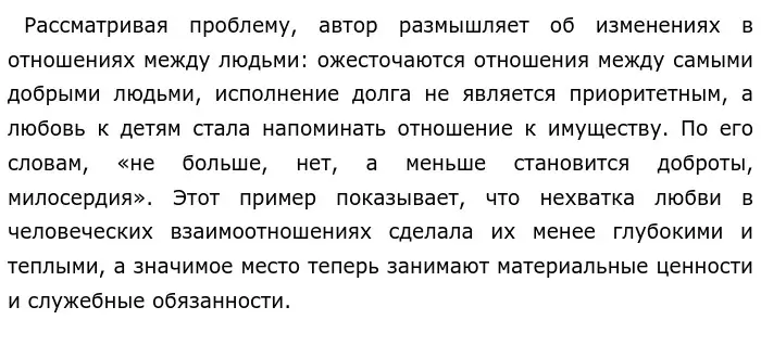 Оба примера, дополняя друг друга, раскрывают глубину проблемы и показывают, что, во-первых, недостаток доброты и любви приводит к ожесточению людей, потере духовных ценностей в межчеловеческих отношениях. Во-вторых, те, кто пренебрегают любовью и добротой получат такое же отношение от окружающих в ответ.