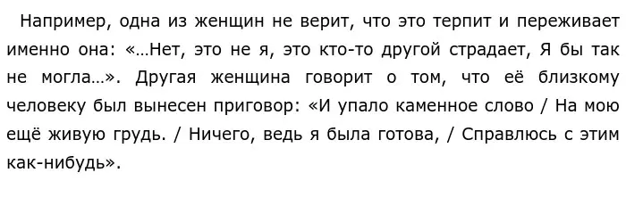 Первой темой, над которой я задумалась, является народная скорбь. Во время многочисленных репрессий страдали не только арестованные, но и их родные, а именно родители, жены, мужья и дети. Весь народ скорбит о погибших и пострадавших. У автора тоже были близкие люди, которых арестовали. Это был муж Николай Гумилев и сын Лев Гумилёв. Данные исторические события никого не обошли стороной. Поэтесса присоединяется к потерпевшим, сопереживая им.