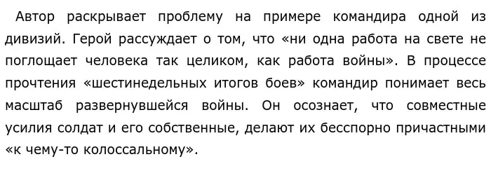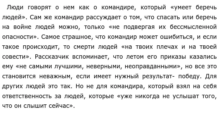 Автор считает, что в годы войны роль командира особенно велика и трудна. Командир обязан беречь жизни и делать правильные стратегические шаги, которые приведут к победе. На плечах командования лежит огромная ответственность.