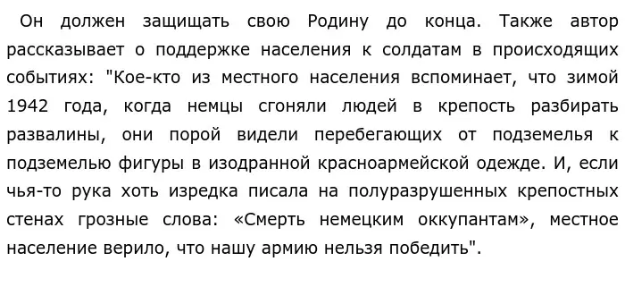 Размышляя над этой проблемой, автор повествует о человеке, который до последнего старается защитить свою Родину: «Там, в подземелье, до сих пор скрывается один русский. Поскольку он не хочет сдаваться и стоит насмерть, ты должен уговорить его выйти наверх и сложить оружие». Так автор убеждает нас в том, что даже в одиночку человек не должен терять веры в победу.
