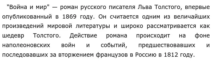 В заключение хочу сказать, что "Война и мир" — это великолепное произведение литературы, которое продолжает очаровывать читателей спустя более 150 лет после публикации. Благодаря своим богатым персонажам, запутанному сюжету и глубоким темам, роман предлагает мощный комментарий о состоянии человека и смысле жизни. Это нестареющий шедевр, который продолжают широко читать и прославлять во всём мире.