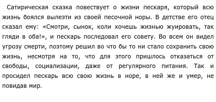 «Премудрый пискарь» — это далеко не детское, несмотря на свой формат, произведение, поднимающее множество важных проблем. Это сатира на общественную ситуацию, сложившуюся во времена написания сказки, которая позволяет нам, современным читателям, лучше понять исторические события.