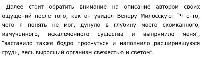 Эти примеры дополняют друг друга. В первом автор повествует о своем состоянии до того, как он увидел скульптуру Венеры Милосской. Писатель чувствовал безразличие и равнодушие к произведениям искусства, окружавшим его. Во втором примере автор описывает свои ощущения после того, как он увидел Венеру Милосскую: он испытал радость и восторг. Скульптура произвела на писателя сильное впечатление, пробудила его, наполнила “свежестью”.