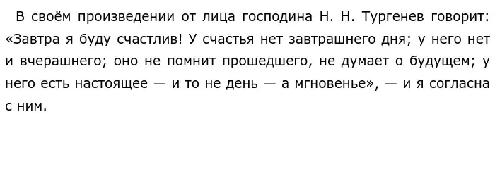 Счастье — это очень сложное понятие, и для каждого человека оно своё. Для кого-то счастье — это время, проведённое с любимым человеком, для кого-то — достигнутая цель или осуществлённая мечта, для кого-то - нахождение в прекрасном или любимом месте. Но у счастья нет срока, нет времени, оно приходит только здесь и сейчас, на мгновение.