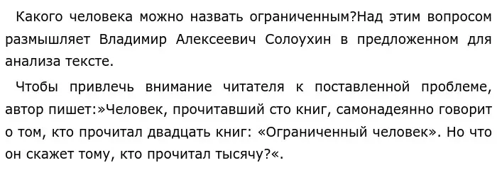 (5)Вообразим горняка, который в угольном пласте разработал вокруг себя некоторое пространство, окружённое толщами непроницаемого чёрного камня. (6)Вот его ограниченность. (7)Каждый человек в незримом, но тем не менее непроглядном пласте мира и жизни разработал вокруг себя некоторое пространство знаний. (8)Он находится как бы в капсуле, окружённой безграничным, загадочным миром. (9)«Капсулы» разные по размерам, потому что один знает больше, а другой меньше. (10)Человек, прочитавший сто книг, самонадеянно говорит о том, кто прочитал двадцать книг: «Ограниченный человек». (11)Но что он скажет тому, кто прочитал тысячу? (12)И нет, я думаю, человека, который прочитал бы все книги.