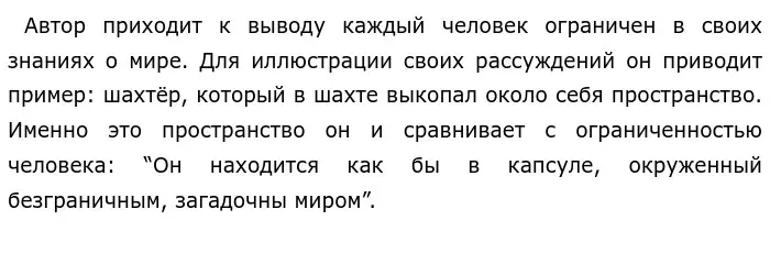(5)Вообразим горняка, который в угольном пласте разработал вокруг себя некоторое про-странство, окружённое толщами непроницаемого чёрного камня. (6)Вот его ограниченность. (7)Каждый человек в незримом, но тем не менее непроглядном пласте мира и жизни разработал вокруг себя некоторое пространство знаний. (8)Он находится как бы в капсуле, окружённой без-граничным, загадочным миром. (9)«Капсулы» разные по размерам, потому что один знает больше, а другой меньше. (10)Человек, прочитавший сто книг, самонадеянно говорит о том, кто прочитал двадцать книг: «Ограниченный человек». (11)Но что он скажет тому, кто прочитал тысячу? (12)И нет, я думаю, человека, который прочитал бы все книги.
